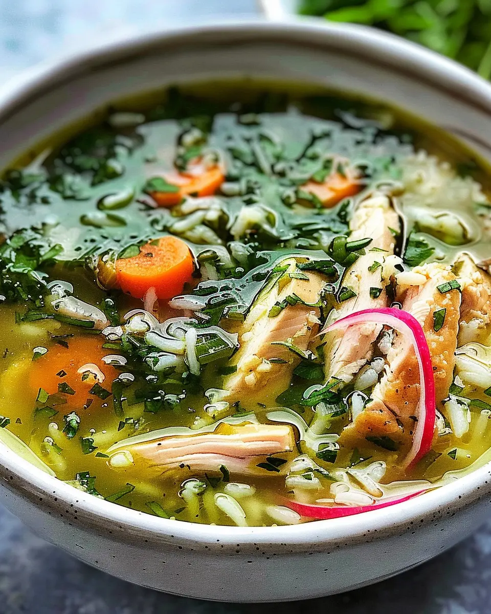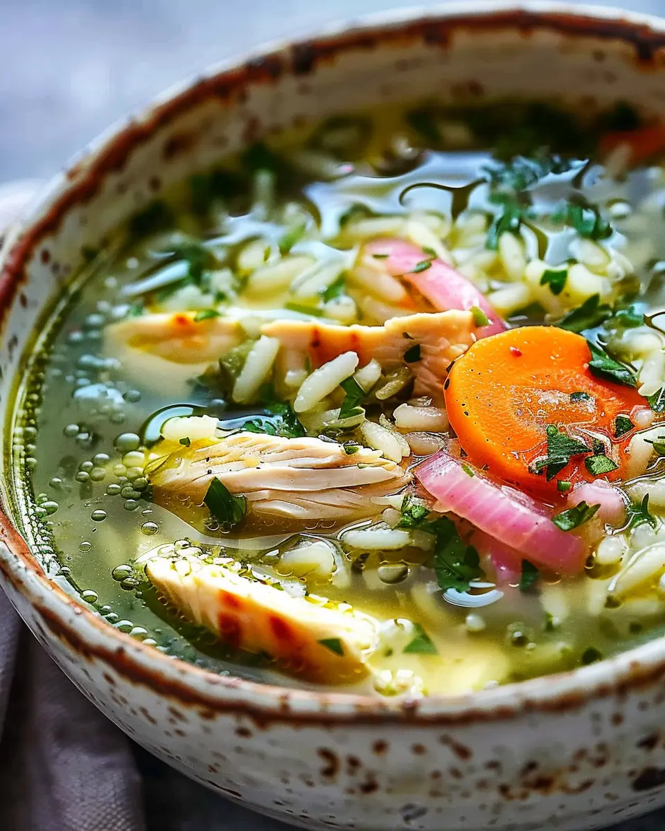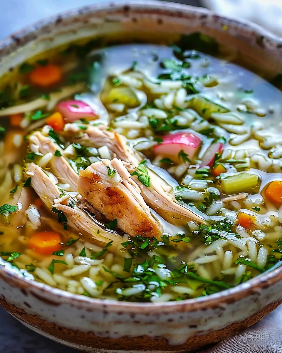 A comforting and aromatic chicken and rice soup infused with fresh herbs.