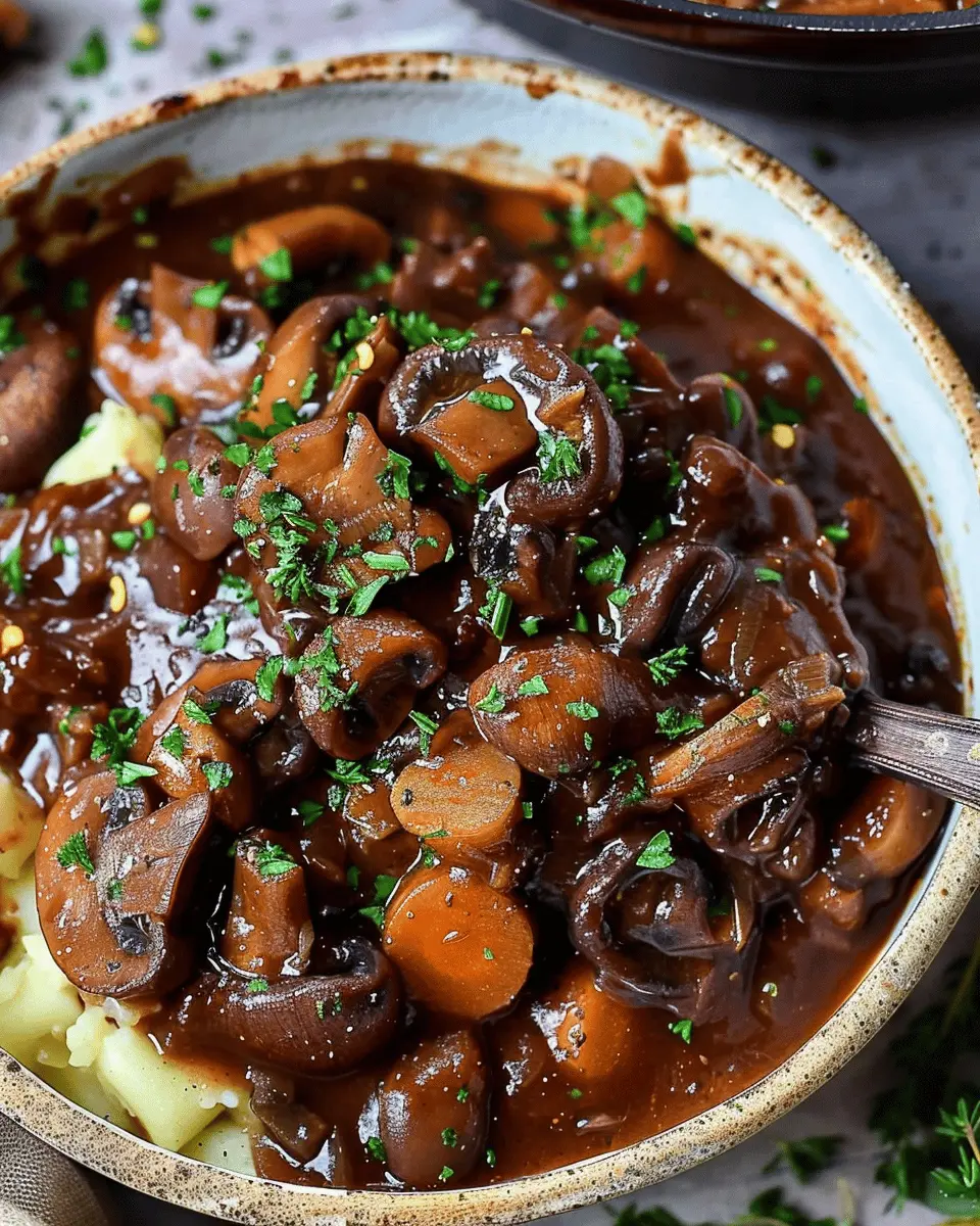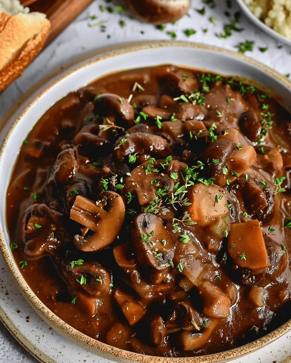 A rich and hearty vegan version of the classic French dish, mushroom bourguignon, featuring tender mushrooms, aromatic herbs, and a robust sauce.